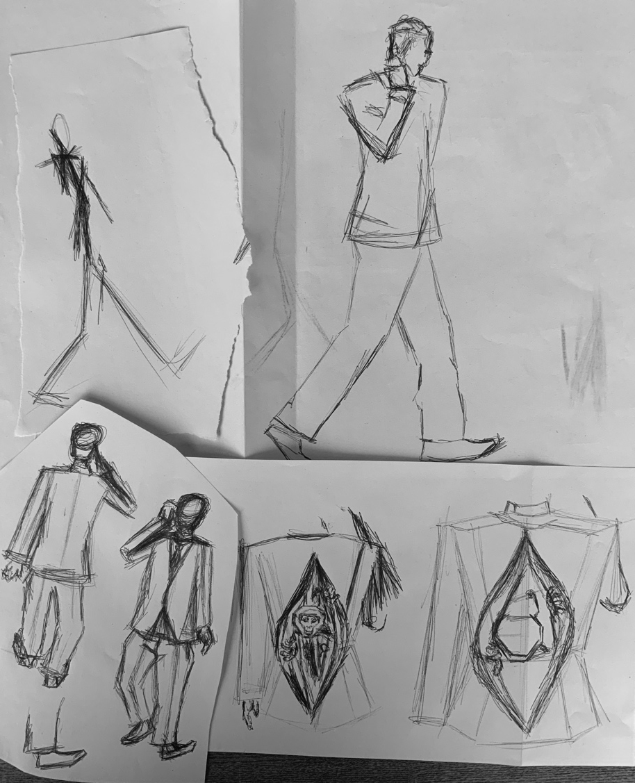 Hier sehen sie Kopf und Handy+Hand Skizzen. Es ging dabei um die Frage, wie diese rustikal und