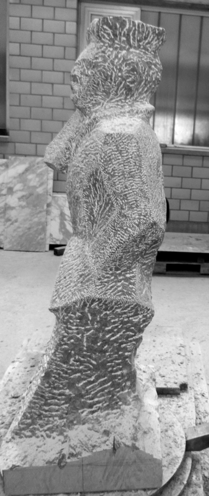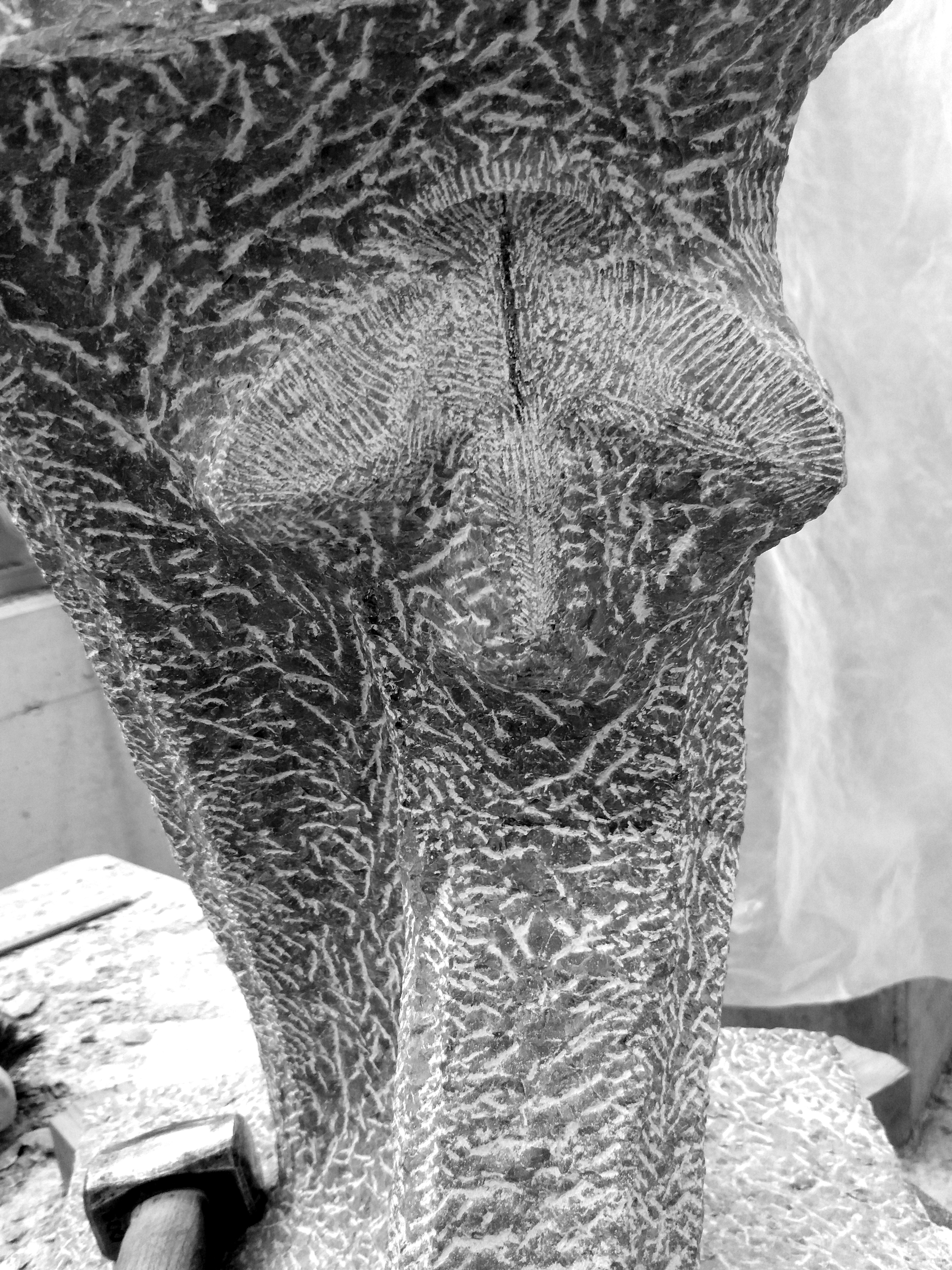 gleich bearbeitet, wie die gesamte Figur, mit Spitzeisen, Zahneisen und Setzer.