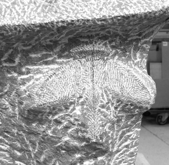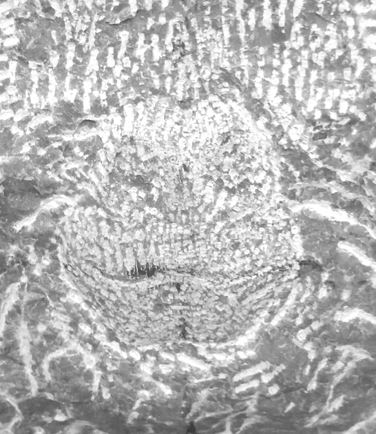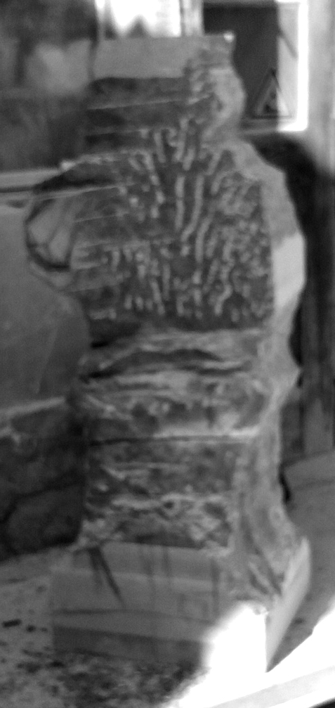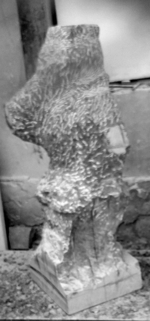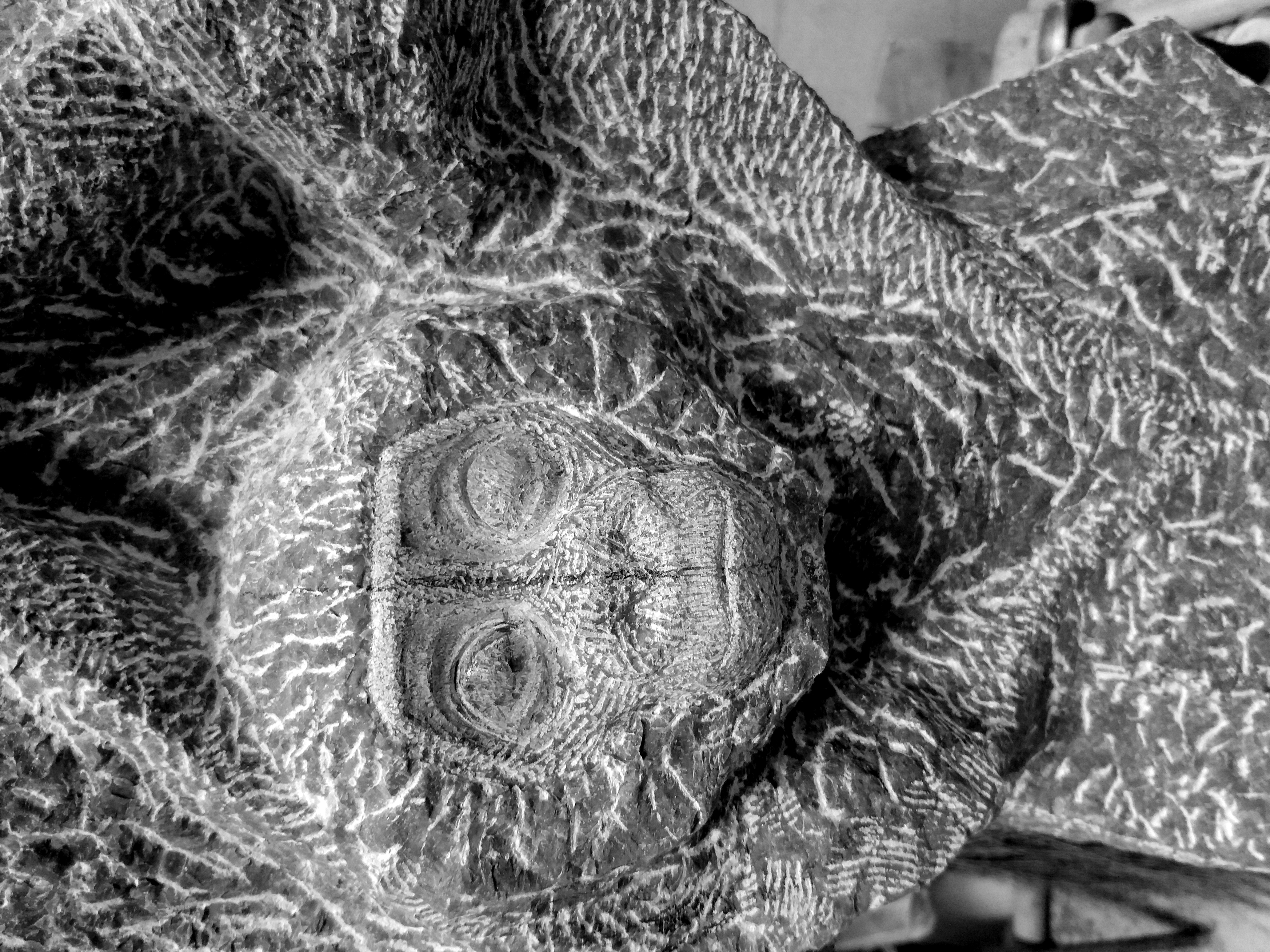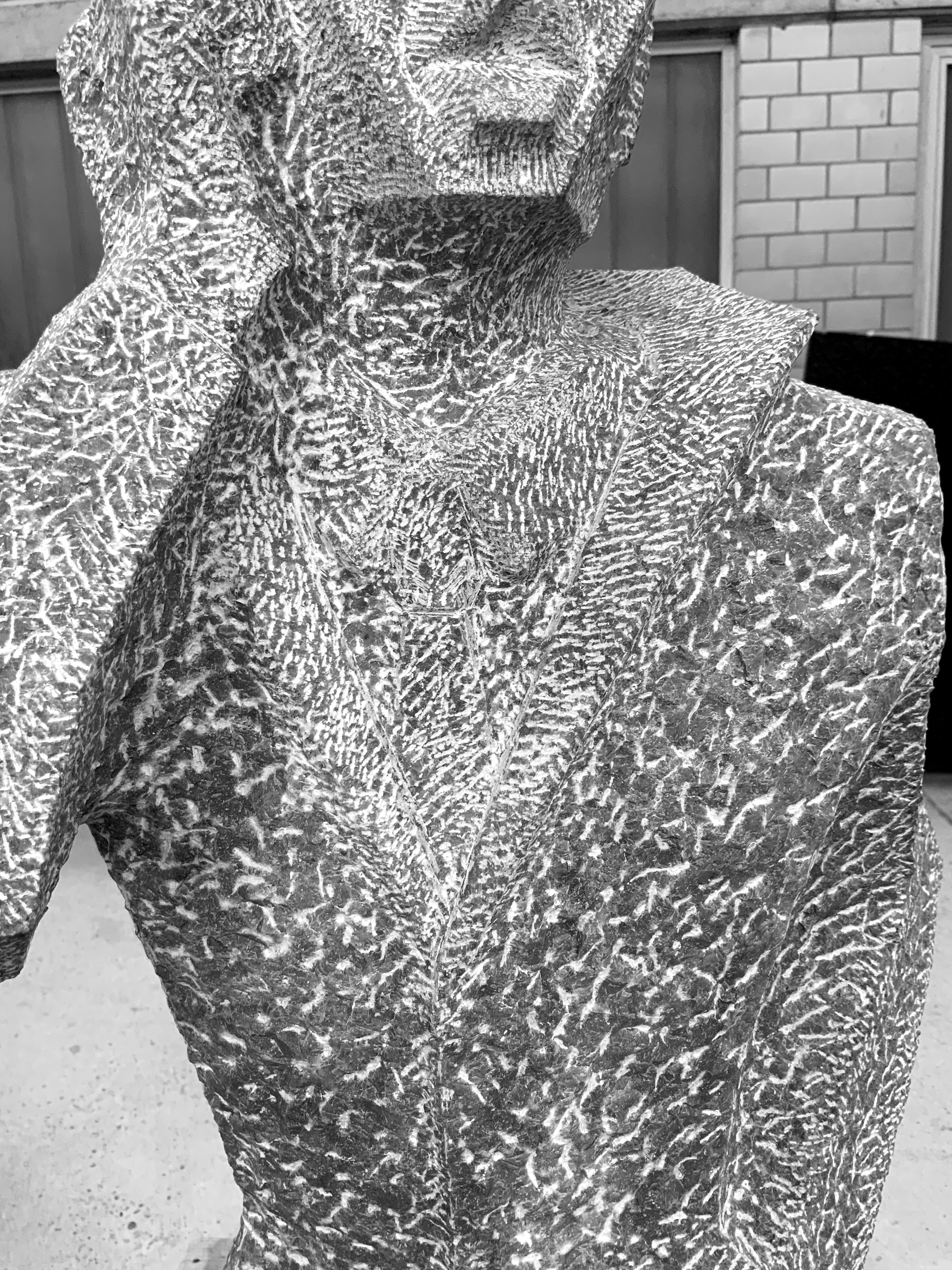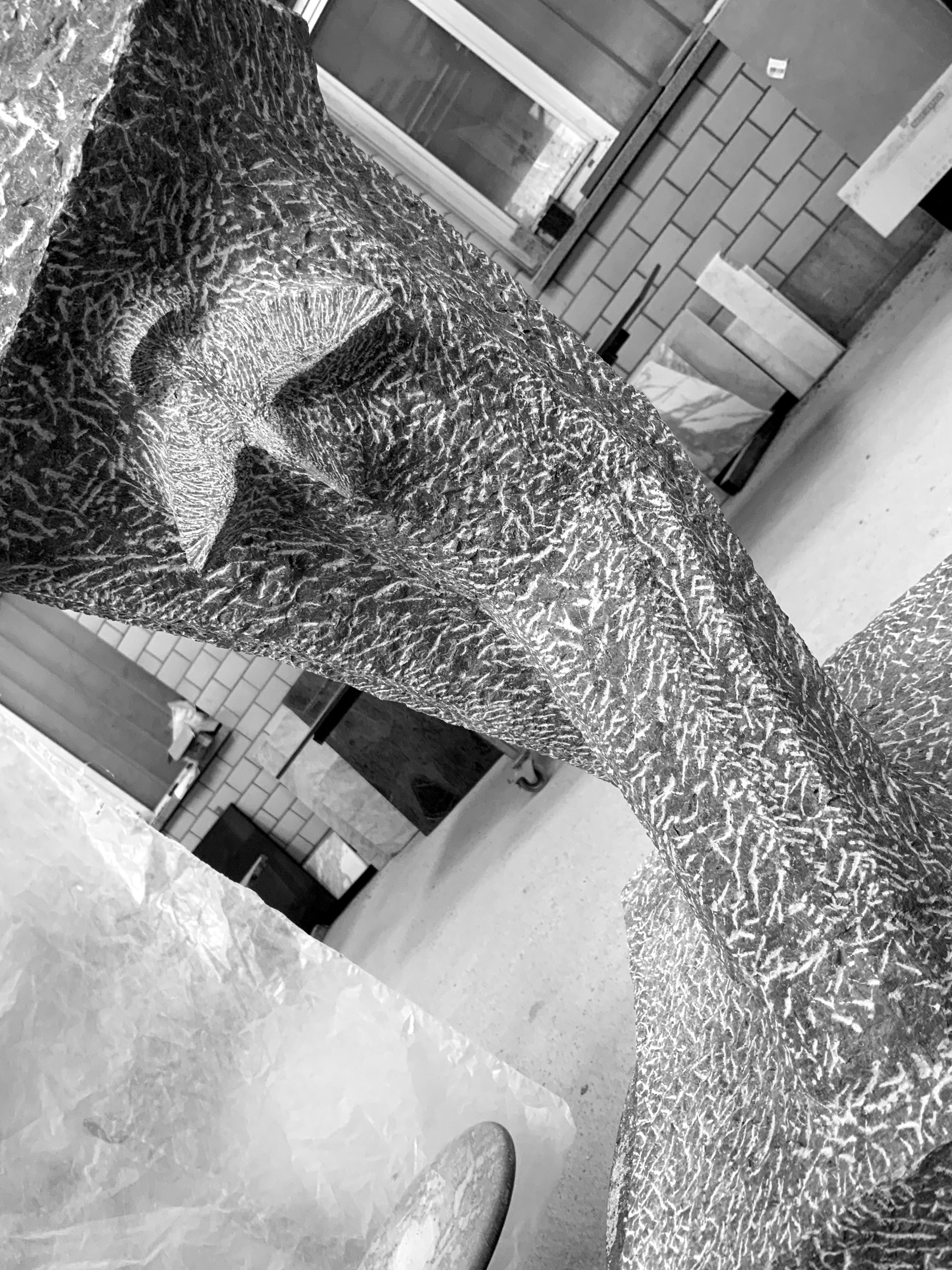 gleich bearbeitet, wie die gesamte Figur, mit Spitzeisen, Zahneisen und Setzer.