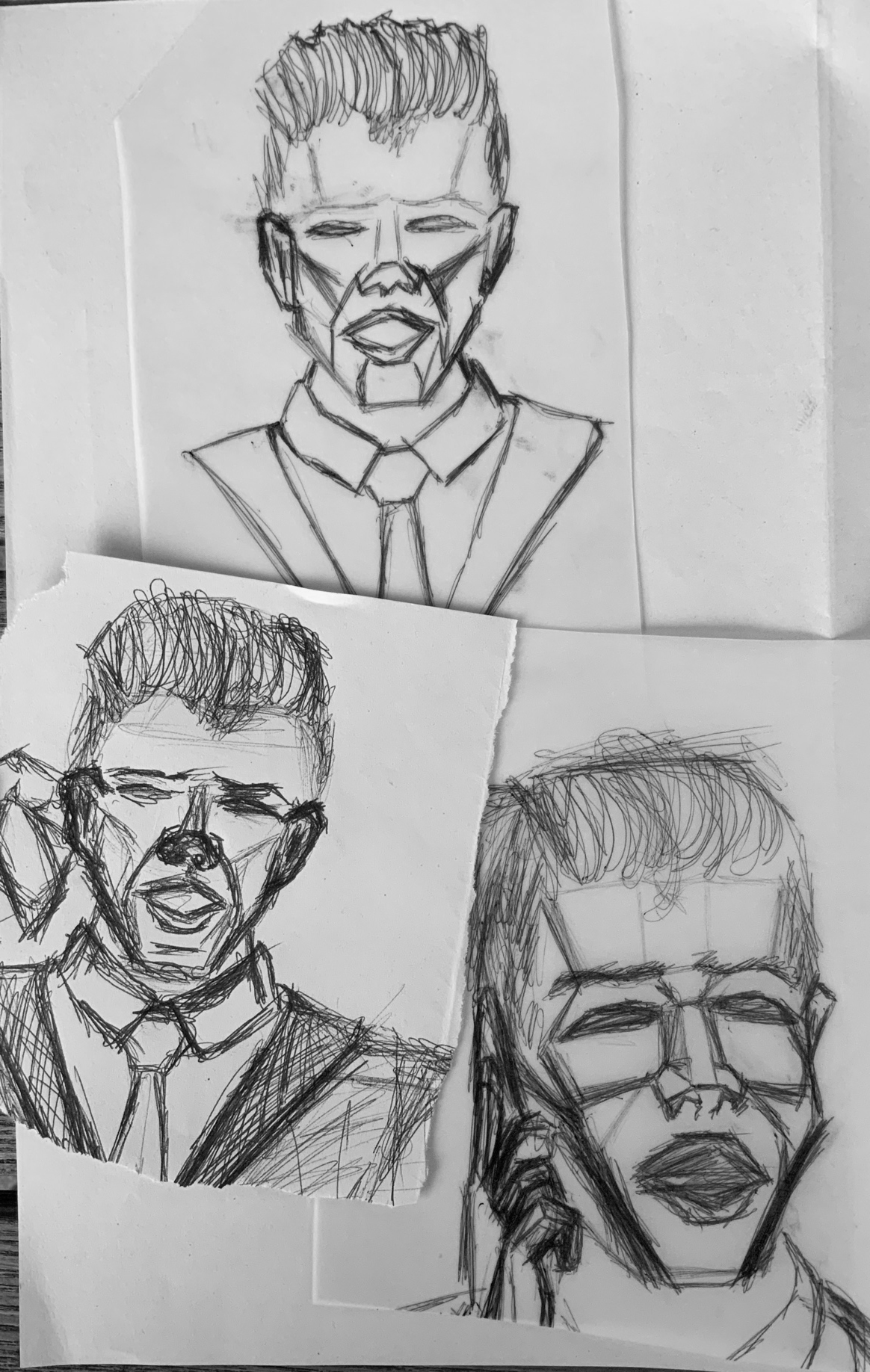 Hier sehen sie Kopf und Handy+Hand Skizzen. Es ging dabei um die Frage, wie diese rustikal und